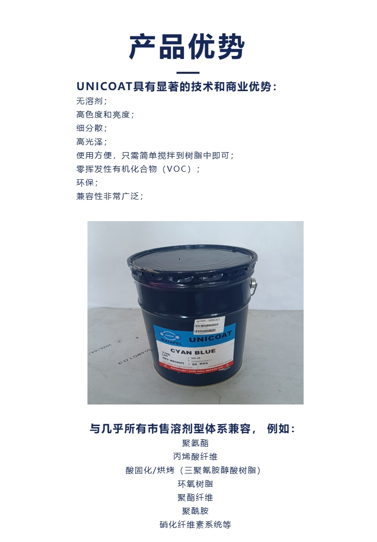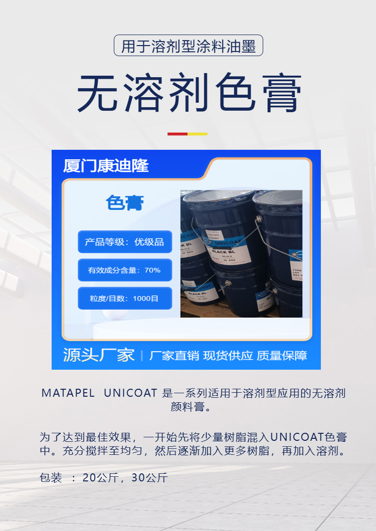 二、该色膏特点:高浓缩性;超一般亮泽的色彩;多应用性,适用于任何树脂系统;耐光耐侯性佳;不含 VOC ;使用简单,分散性很好,一般不需任何助剂就可以很好溶解。主要用于玻璃纤维增强塑料产品、油漆、光亮漆、油墨、三合板、PVC、和PU皮革、海绵、纺织品印刷、OPP胶带等。